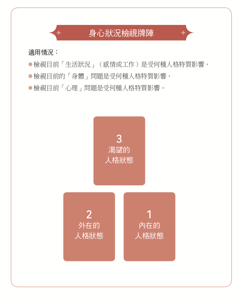 以這組三張牌陣(身心狀況檢視)為例,這是萬用牌陣,適用於所有問題與任何主題。在抽牌時,你要注意──